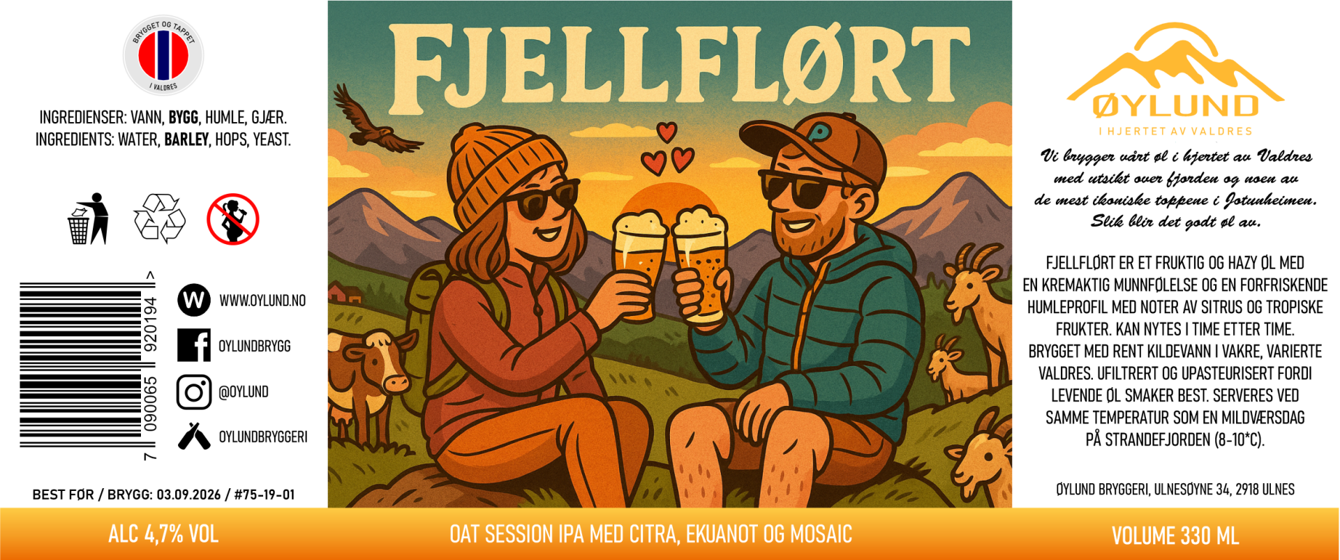 FJELLFLØRT ER ET FRUKTIG OG HAZY ØL MED EN KREMAKTIG MUNNFØLELSE OG EN FORFRISKENDE HUMLEPROFIL MED NOTER AV SITRUS OG TROPISKE FRUKTER. KAN NYTES I TIME ETTER TIME. BRYGGET MED RENT KILDEVANN I VAKRE, VARIERTE VALDRES. UFILTRERT OG UPASTEURISERT FORDI LEVENDE ØL SMAKER BEST. SERVERES VED SAMME TEMPERATUR SOM EN MILDVÆRSDAG